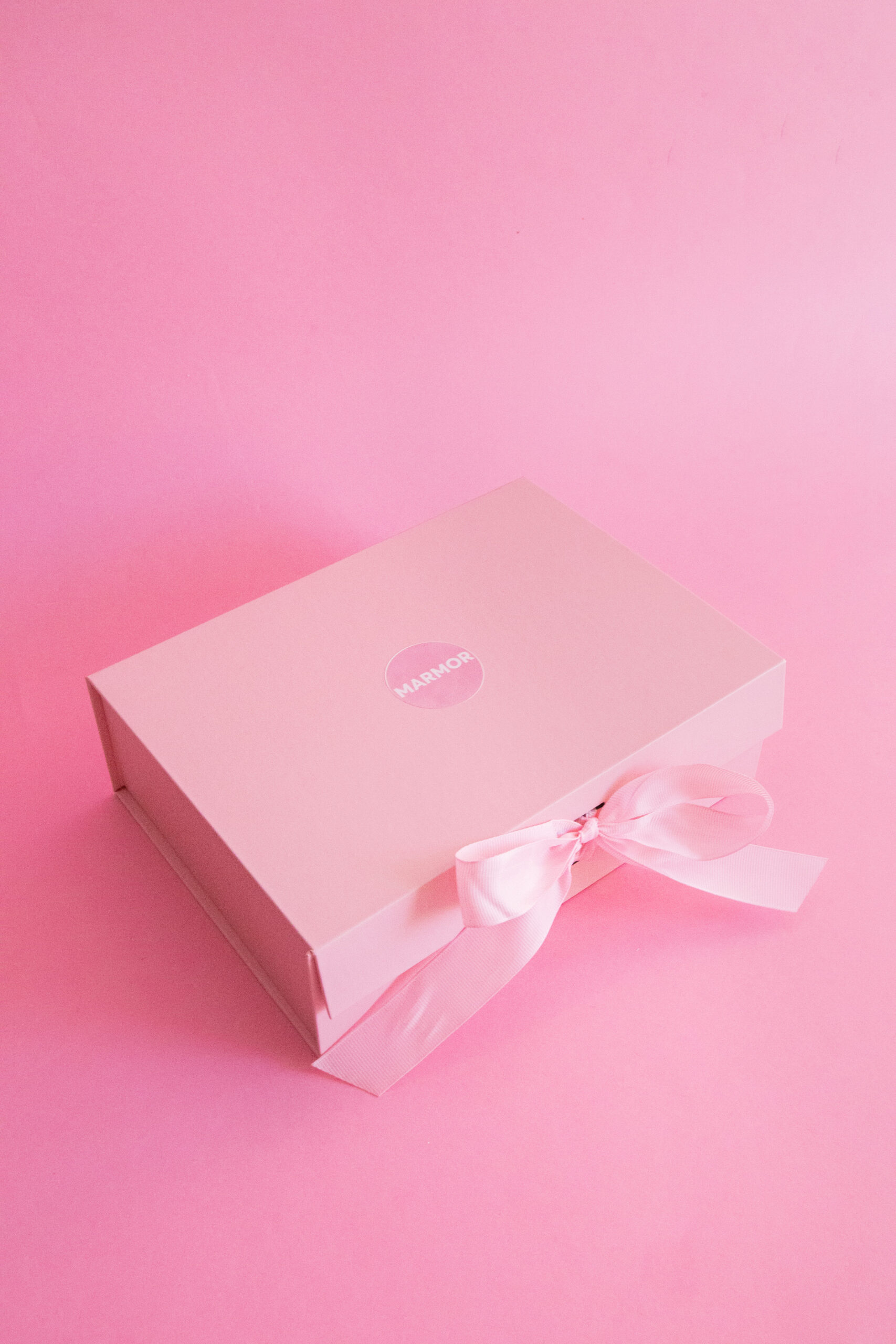 Подарочная коробка с розовой бумагой, логотипом и лентой